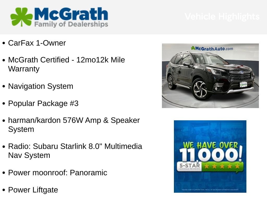 Elevate your driving experience with the Forester Touring's standout features, including a Navigation System, a premium harman/kardon 576W Amp & Speaker System, a Panoramic Power Moonroof, and a Power Liftgate. Enjoy the convenience of the Exterior Parking Camera Rear, Auto-Dimming Exterior Mirror with Approach Lighting, and the intuitive Subaru STARLINK 8.0" Multimedia Navigation System.
